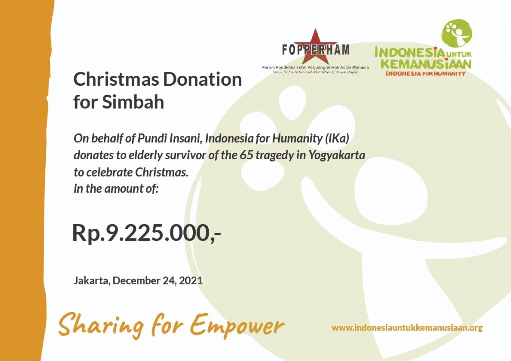 Indonesia for Humanity (IKa) and Fopperham held a fundraising event for Pundi Insani for the 2021 Christmas Gift for the elderly of Tragedy ’65 survivors, which was held on 16 – 23 December 2021. The final result of the fundraising was a donation of Rp. 9.225.000,- (nine million two hundred twenty five thousand rupiahs). The donation has been handed over by IKA to Fopperham. In the future, Fopperham will distribute it to the elderly of Tragedy ’65 survivors in Yogyakarta.